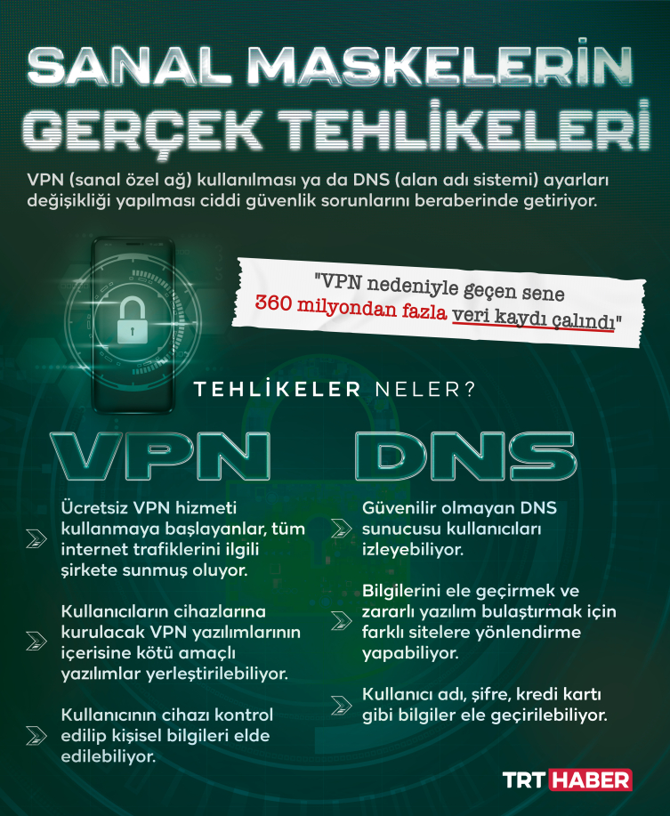 Özellikle ücretsiz sunulan VPN hizmetlerinde ciddi güvenlik riskleri bulunuyor. Bu hizmetler çoğunlukla kullanıcıların veri trafiğini ele geçirmek amacıyla güvenilir olmayan sağlayıcılar tarafından sunuluyor. Sağlayıcılarının güvenilir olup olmadığına bakmadan ücretsiz kullanmaya başlayan kullanıcılar, tüm internet trafiklerini ilgili şirkete sunmuş oluyor.