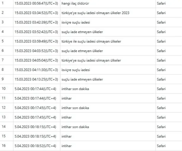 Kaçma planı yapan Seçil Erzan'ın farklı tarihlerde internet arama geçmişinde "Hangi ilaç öldürür", "Türkiye'ye suçlu iadesi olmayan ülkeler 2023","İsviçre suçlu iadesi", "Şuçlu iade etmeyen ülkeler", "İntihar çeşitleri", "Fare zehiri insanı kaç saatte öldürür", "Nasıl intihar edilir", "Kendini asma", "Bilekleri kesmek" gibi aramalar yaptığı ortaya çıktı.