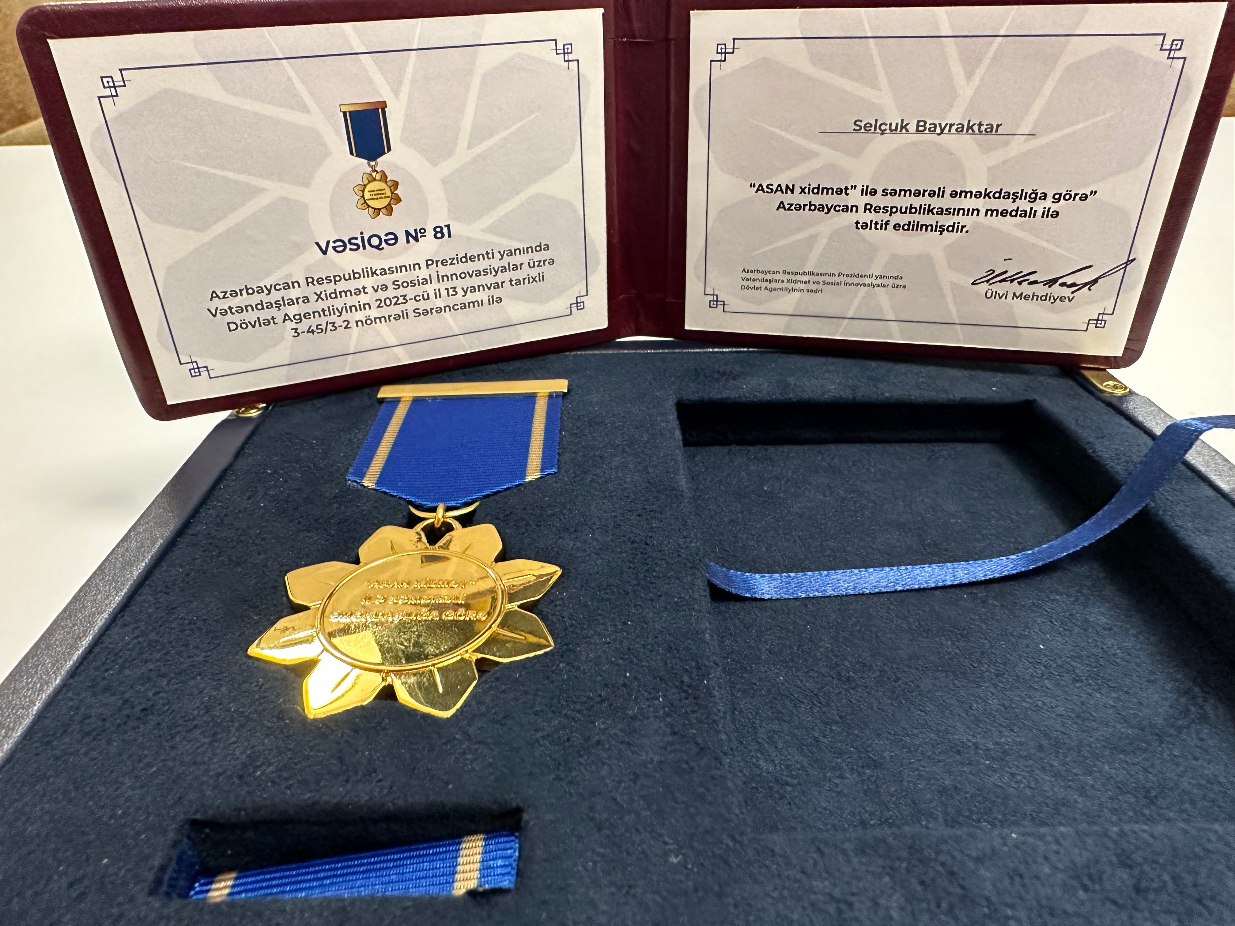 Azerbaycan Cumhurbaşkanı İlham Aliyev tarafından 2021’de Karabağ Nişanı’na layık görülen Baykar Yönetim Kurulu Başkanı Selçuk Bayraktar, Azerbaycan Cumhurbaşkanlığı Vatandaşlara Hizmet ve Sosyal İnovasyonlar Devlet Ajansı (ASAN Hizmet) Verimli İş Birliği Madalyası ile ödüllendirildi.