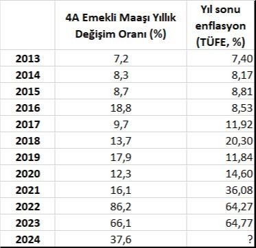 TÜİK'in açıkladığı yıl sonu enflasyon oranları baz alındığında son 10 yılda 2 yıl hariç SGK emeklisinin enflasyonla başa baş zamlar aldığı söylenebilir. Son 10 yılın 5'inde SGK emeklisi enflasyonun üzerinde zam alırken 2021'de ve 2018'deki devasa farklar hariç diğer yıllarda da enflasyonun 1-2 puan altında zamla karşılaşmış.