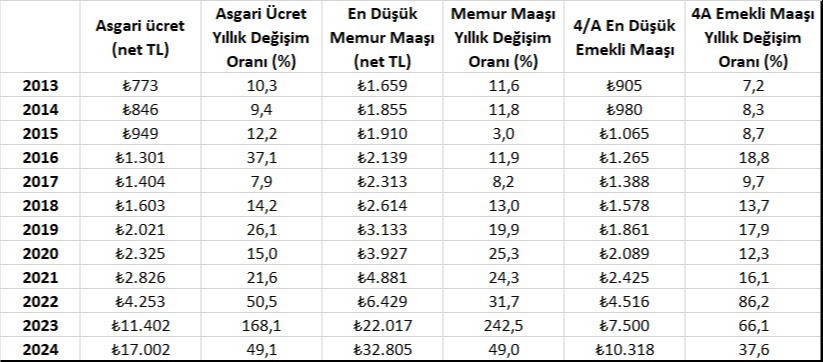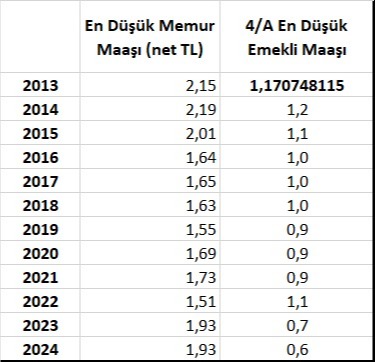 Asgari ücreti baz alarak en düşük memur maaşları ile en düşük SGK-Bağkur emeklisi maaşları kıyaslandığında son yıllardaki düşüş göze çarpıyor. 10 yıl önce asgari ücretin üzerinde olan en düşük emekli maaşları 2023 ve 2024 yıllarında %60'ına kadar gerilemiş durumda. Aynı dönemlerde en düşük memur maaşlarının asgari ücretin 2 katı ile 1,5 katı arasında seyrettiği görülüyor.