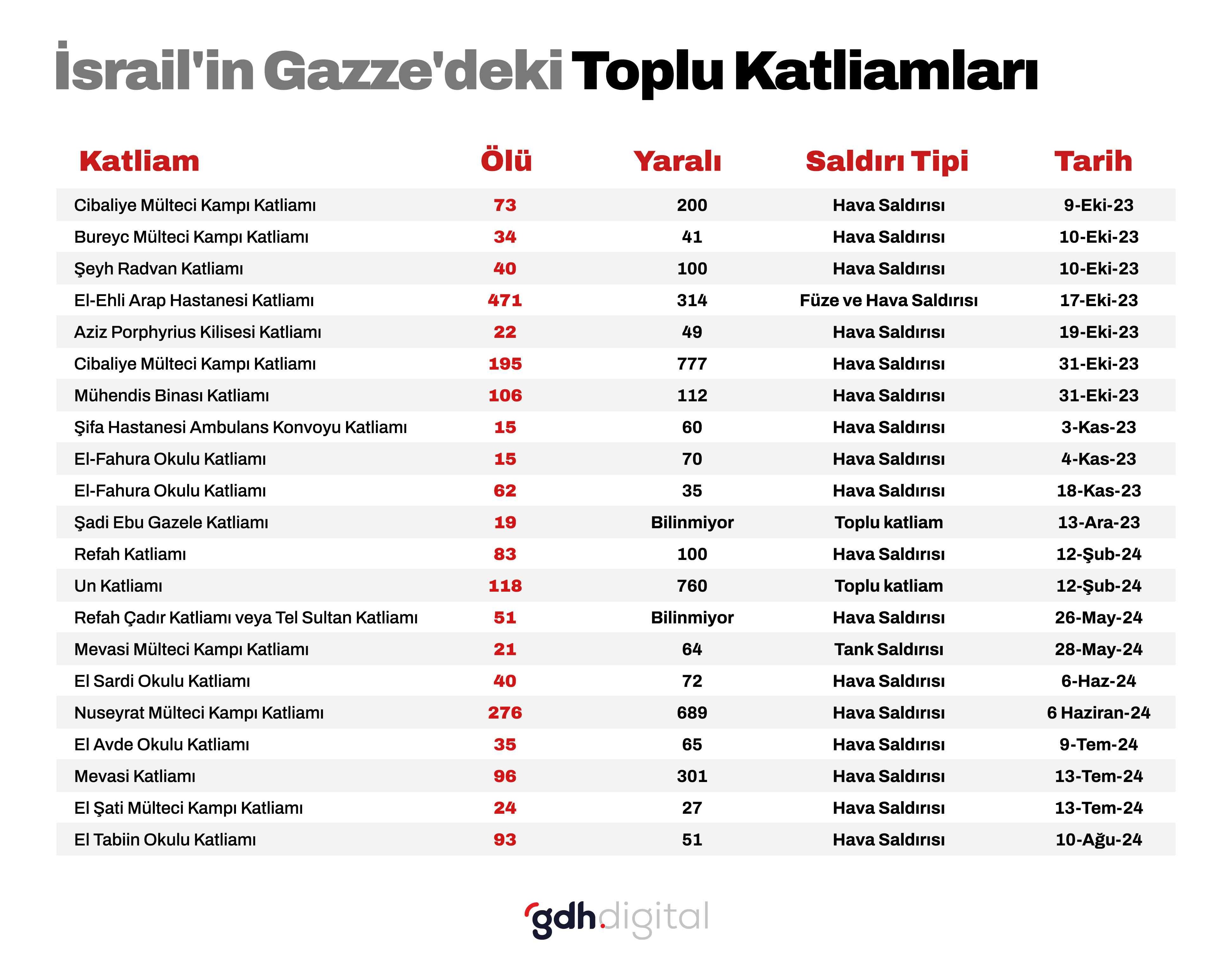 İsrail'in hava saldırıları ve topçu saldırıları başladığı andan itibaren Gazze'de katliamlar yaşanmaya başladı. 7 Ekim 2023'ten bu yana İsrail çoğu hava saldırıları ile en az 75 toplu katliam olmak üzere 3628 gerçekleştirdi. Bu katliamlardan bazıları soykırımın somut kanıtı olarak karşımıza çıkıyor:
