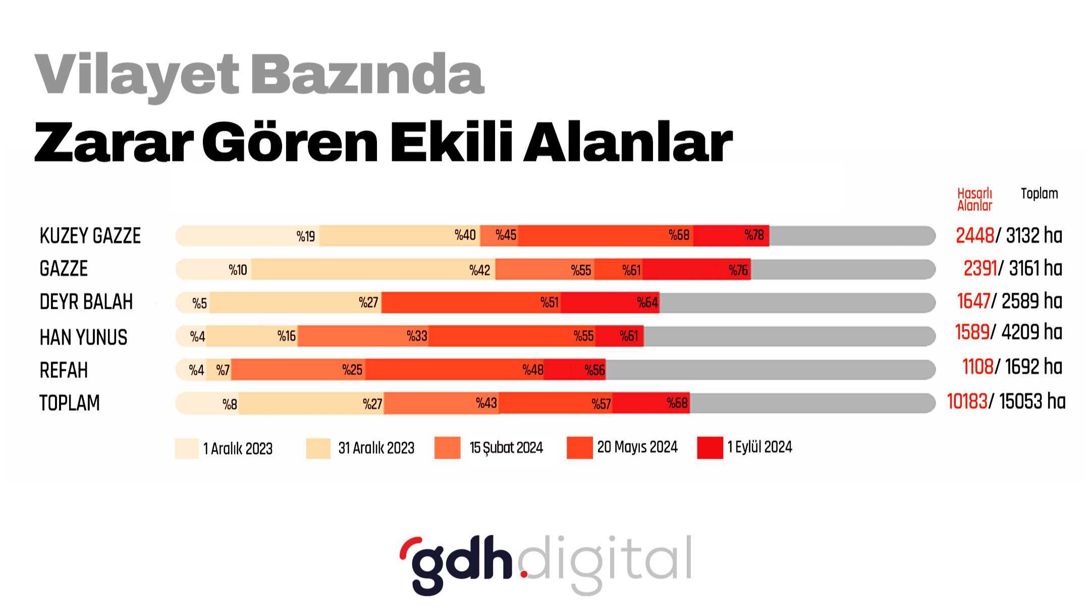 Birleşmiş Milletler Gıda ve Tarım Örgütü verilerine göre, 1 Eylül 2024 itibariyle Gazze'deki ekili alanların %67,6'sı, yani 10183 hektarı zarar görmüştür. Bu oran Mayıs ayında %57,3 (8660 hektar) ve Şubat 2024'te %42,6 (6694 hektar) idi.