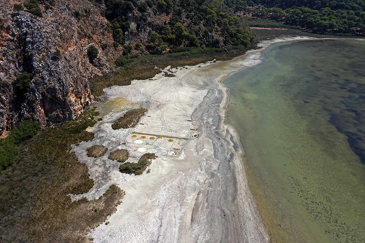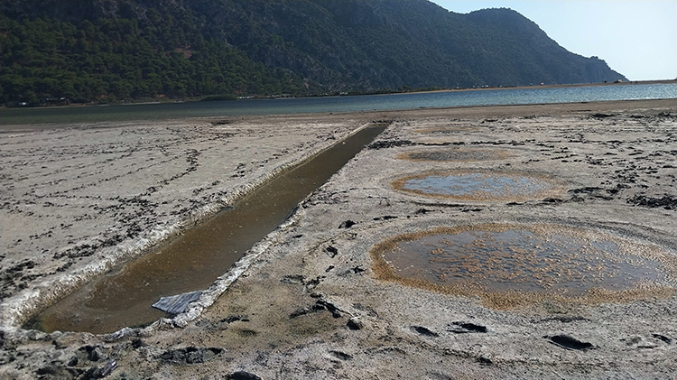 Muğla'nın Ortaca ilçesindeki İztuzu Plajı'nda suların çekilmesiyle tuz tesisi olarak kullanılan 2 bin yıllık tuz sahası gün yüzüne çıktı.