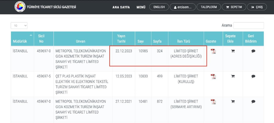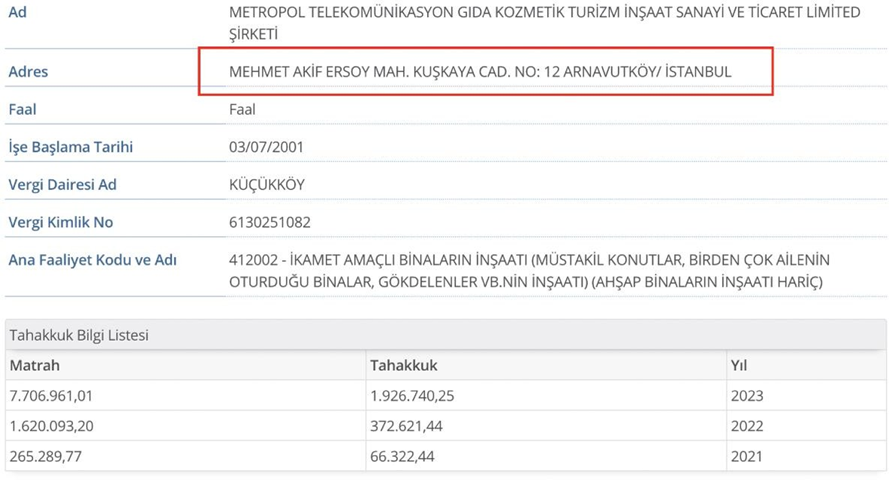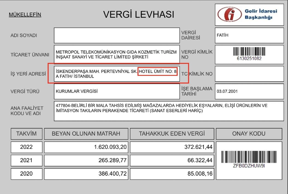 Metropol Telekomünikasyon Gıda Kozmetik Turizm İnş. San. Ve Tic. Ltd. Şti. Ünvanlı şirketin 2022 yılına ait Matrah ve Tahakkuk bilgilerinin yer aldığı Vergi Levhası’nda da şirketin görünen adresi yine bu Hotel’in odası. Şirket, ihaleyi aldıktan sonra ve anahtar teslim olarak projeyi bitirip Arnavutköy Belediyesi’ne teslim etmesi gereken tarih olan 30 Aralık 2023’ten 8 gün önce 22 Aralık 2023’te adres değişikliği yaparak, Fatih ilçesinde yer alan Hotel odasından şirketi Arnavutköy İlçesine taşıyor.