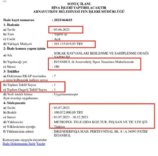 3 Temmuz 2023 tarihinde sözleşmesi imzalanan ve tamamlanan ihaleye sadece 1 teklif veriliyor ve 100 Milyon 72 Bin TL bedelle ihaleyi METROPOL TELE. GIDA KOZ. TUR. İNŞ. SAN. VE TİC LTD ŞTİ. alıyor.