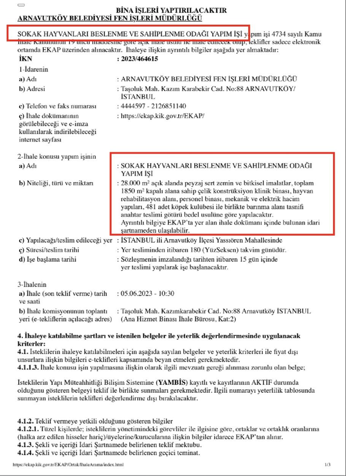İhale hakkında yayınlanan ilanda, ’28.000 m² açık alanda peyzaj sert zemin ve bitkisel imalatlar, toplam 1850 m² kapalı alana sahip çelik konstrüksiyon klinik binası, hayvan rehabilitasyon alanı, personel binası, mekanik ve elektrik hacim yapıları, 481 adet köpek kulübesi ile birlikte barınma alanı tasnifi anahtar teslimi götürü bedel usulüne göre yapılacaktır.’ denilirken, ihale maliyeti olarak belirlenen meblağ ise, 101 Milyon 135 Bin 19 TL