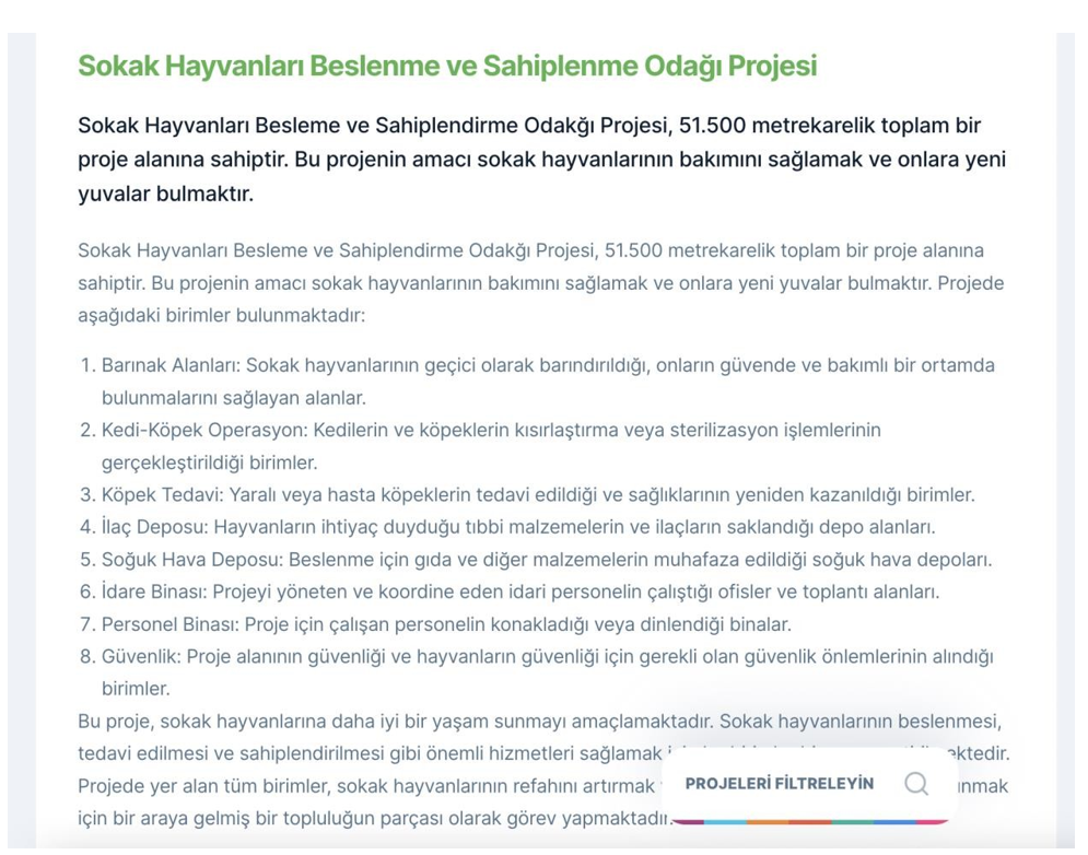 ‘Sokak Hayvanları Besleme ve Sahiplendirme Odağı Projesi, 51.500 metrekarelik toplam bir proje alanına sahiptir. Bu projenin amacı sokak hayvanlarının bakımını sağlamak ve onlara yeni yuvalar bulmaktır. Barınak Alanları, Kedi-Köpek Operasyonu, Köpek Tedavi, İlaç Deposu, Soğuk Hava Deposu, İdare Binası, Personel Binası, Güvenlik’ olmak üzere 8 başlık altında proje hakkında bilgi verilmiş durumda.
