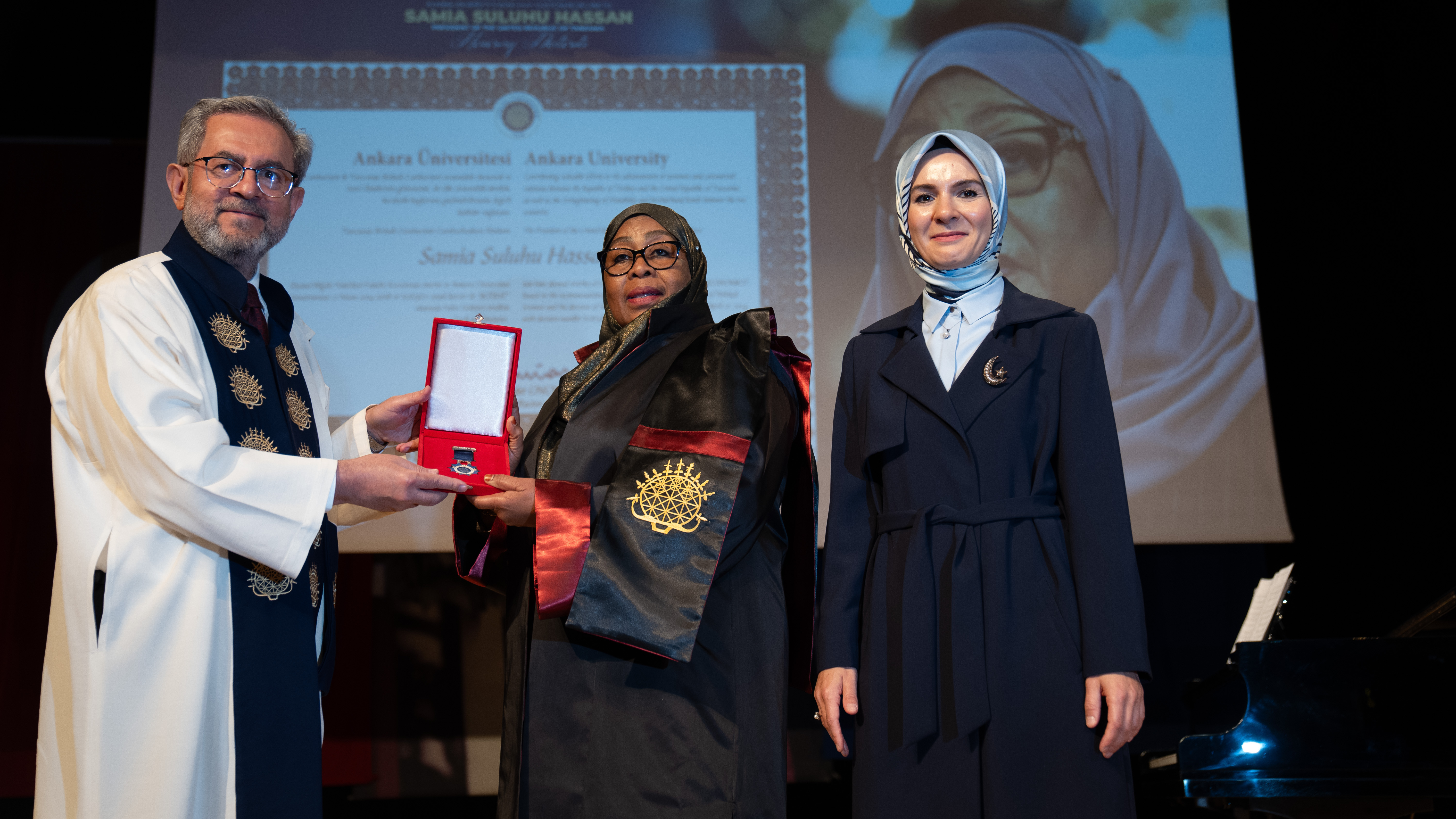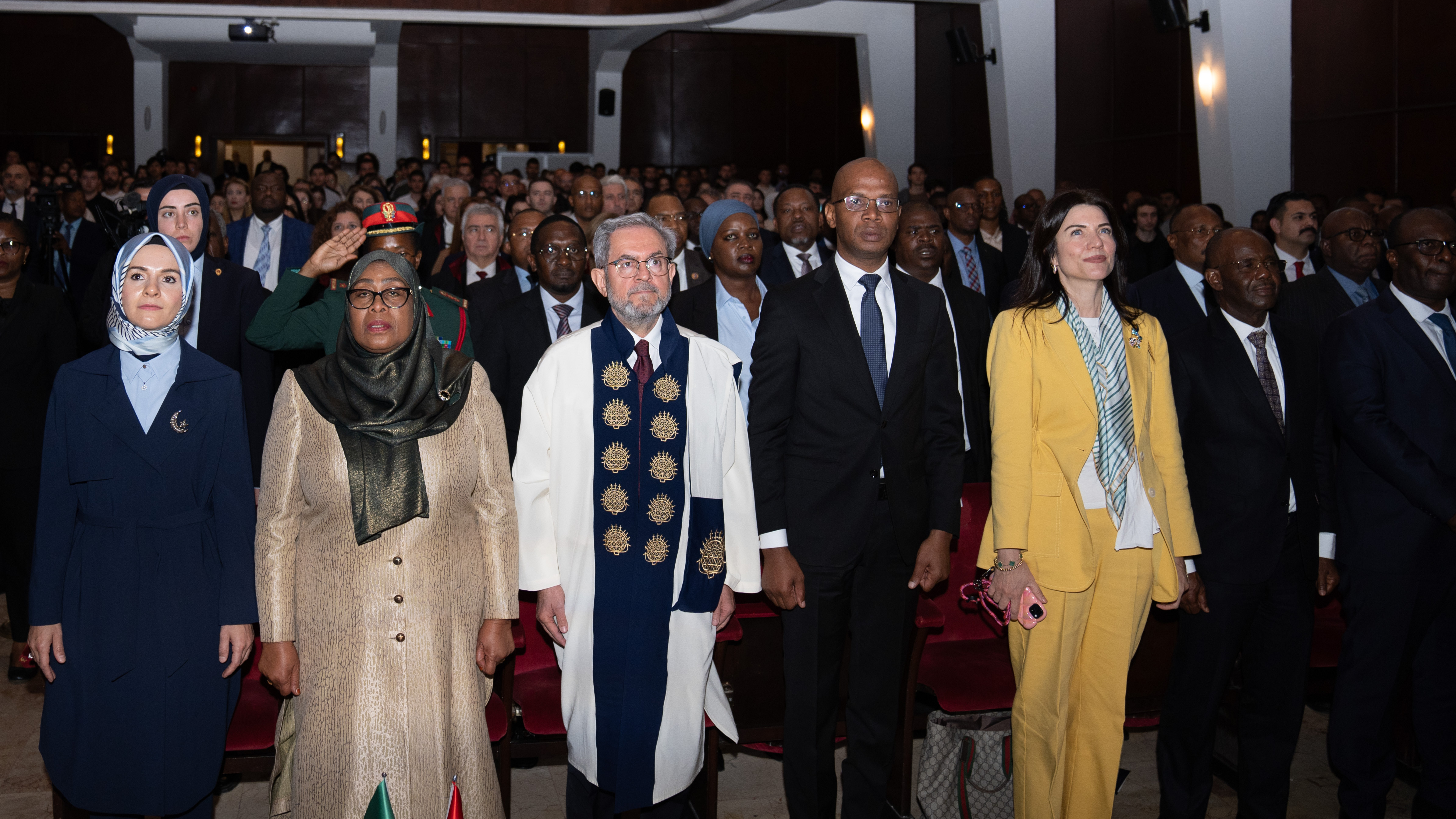 Törenin sonunda Rektör Ünüvar tarafından Tanzanya Cumhurbaşkanı Hassan'a cübbe giydirildi.