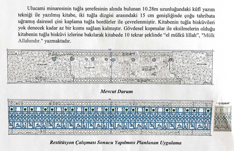 Böylece bu yazıları görür görmez üst kısımda kaybolanları da bulmak adına yine tekniği açısından kullanıyorum 'bisküvi' dediğimiz, altta kalan harçlardan yola çıkarak, çok kıymetli iki hocamızla bu yazıların hakikatini ortaya çıkardık. Allah'a hamd ediyorum. Bu minare, her halükarda yapılır ve düzeltilir. Ancak bu yazılar bulunmazsa büyük bir eksik ve kayıp olurdu. Bugün mutluluğum kat kat arttı"