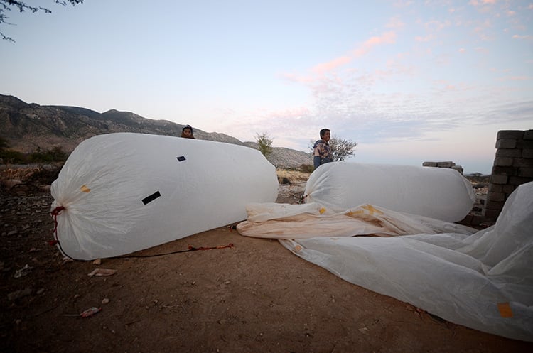 Toprağa gömülü bir hortum vasıtasıyla çıkarılan doğal gaz, kaçağı engellemek için poşetlerin ağzına geçirilen küçük bir vana aracılığıyla torbalara dolduruluyor. Poşetlerin uçan balon gibi havalanmaması için diğer ucu yerde taşa bağlanıyor.