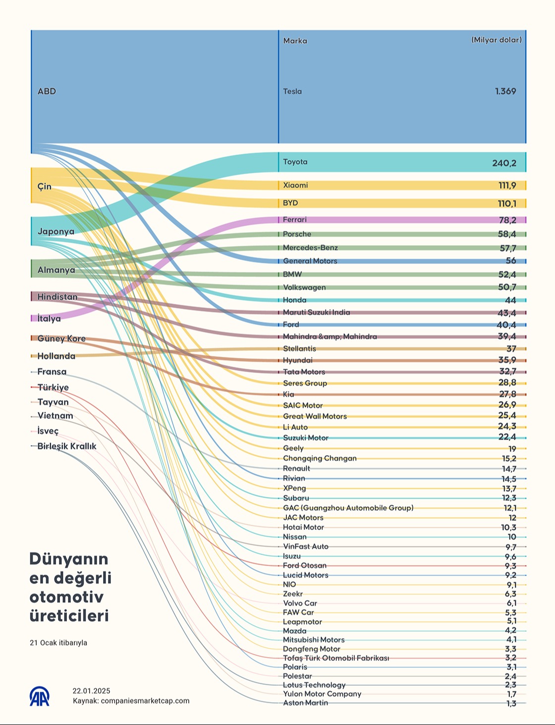 Dünya otomotiv devlerinin piyasa değeri listesinde Tesla lider, Türk markalar ise dikkat çekmeye devam ediyor.