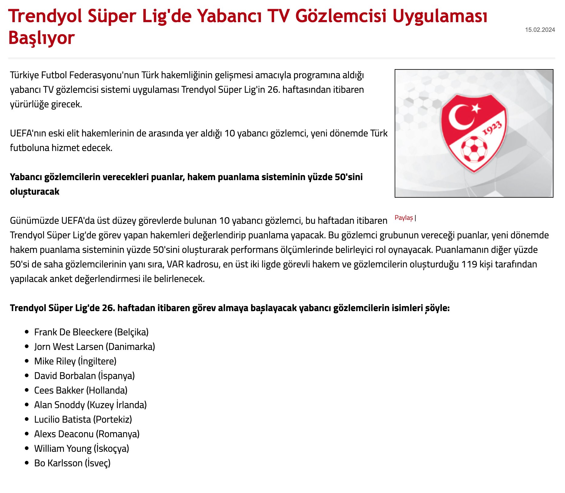 TFF, Süper Lig'de 26. haftadan itibaren yabancı TV gözlemcisi uygulamasının başlayacağını açıkladı.