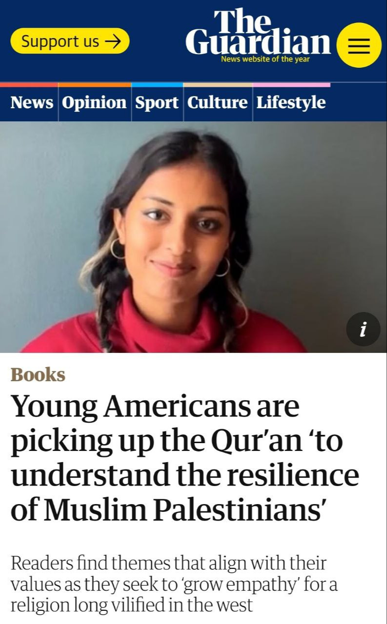 İngiltere merkezli The Guardian, Gazzeli sivillerin direnci karşısında ABD'de Kur'an'ı Kerim okuyan kişilerin sayısının arttığını belirten bir haber yayınladı. Habere göre, Batı'da İslamofobi nedeniyle İslam'a karşı önyargı zirve yaparken, Müslüman Filistinlilerin dayanıklılıklarına hayret eden Genç Amerikalılar, Kuranı Kerîm okuyor.