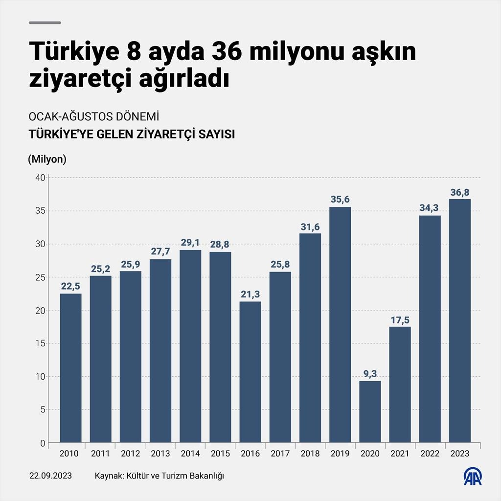 Kültür ve Turizm Bakanlığının açıklamasına göre, bu yıl eylül ayına kadar Türkiye'yi 33 milyon 426 bin 940 yabancı ve 3 milyon 327 bin 206 yurt dışı ikametli vatandaş ziyaret etti.