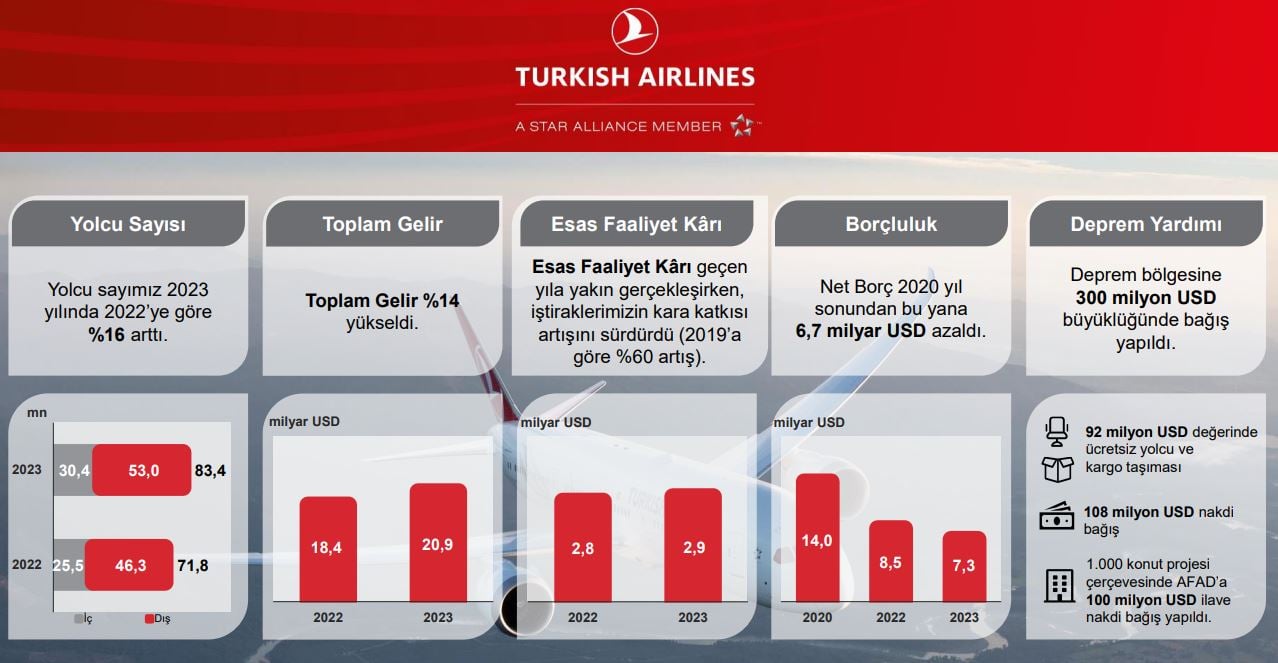 Türk Hava Yolları, 2023 yılına ilişkin finansal sonuçlarını düzenlediği basın toplantısıyla açıkladı. 2023 yılında 83,4 milyon yolcu taşıyan havayolu şirketi, geçen yıla göre yurt içi kapasitesini yüzde 23,5, yurt dışı kapasitesini ise yüzde 16 artırdı.