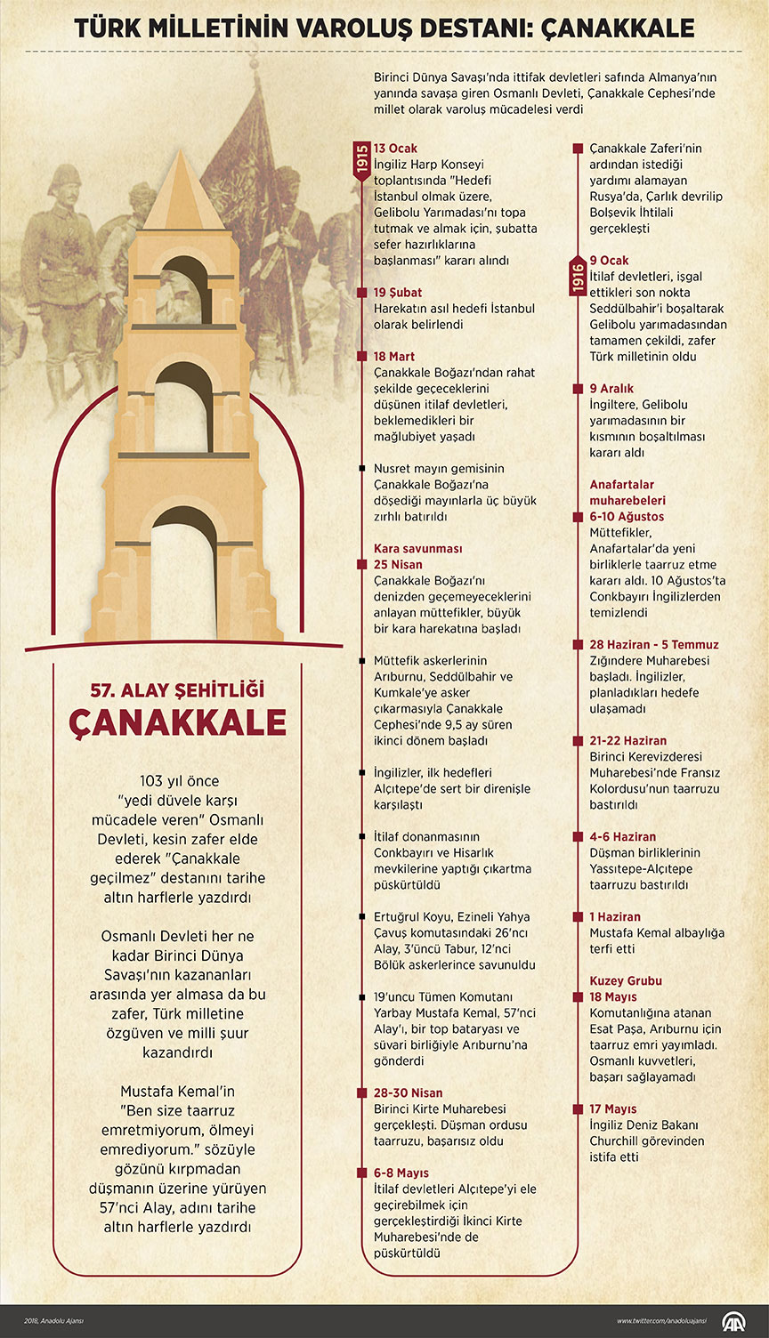 Mustafa Kemal'in "Ben size taarruz emretmiyorum, ölmeyi emrediyorum." sözüyle gözünü kırpmadan düşmanın üzerine yürüyen 57'nci Alay ve diğer birliklerin katıldığı taarruzla ilgili İngiliz subay General Hamilton'ın "Gebe dağlar Türk doğurmaya devam ediyor." sözü de o yıllarda Türk askerinin ortaya koyduğu mücadeleyi akıllara kazıdı.