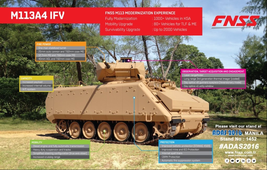 M113 zırhlı araçları: kuvvet yıllardır çeşitli mekanik iyileştirmelerle bu araçları A3 seviyesine yükseltmek için çalışmalar yürütüyor. Zırhlı araçların modern savaş alanı bağlamında korumalarının iyileştirilmesi gerektiği göz önüne alındığında bunlar yetersiz kalmaktadır. Örnek olarak, Türk şirketi FNSS tarafından Suudi M-113 için gerçekleştirilen ve yeni bir güç santrali, şanzıman, motor soğutma sistemleri, 25/30 mm topa sahip silah istasyonu, kara mayınlarına karşı koruma, klima, harici yakıt tankları - mürettebat güvenliğini artırma - harici balistik koruma, yeni gösterge paneli, teşhis ve yönetim modülü, termal kamera, otomatik yangın söndürme sistemi, NBC koruması vb. içeren M-113A4 standardına getirmek için yapılan modernizasyonu ele alalım.