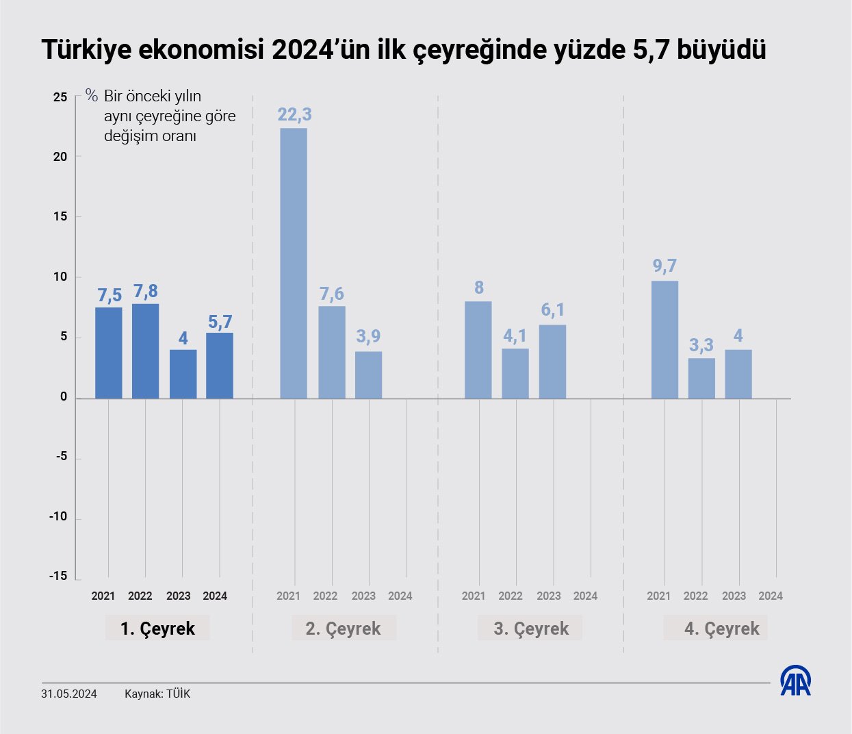 AA muhabirinin yaptığı derlemeye göre, Türkiye ocak-mart döneminde, geçen yılın aynı çeyreğine kıyasla yüzde 5,7 büyüdü.