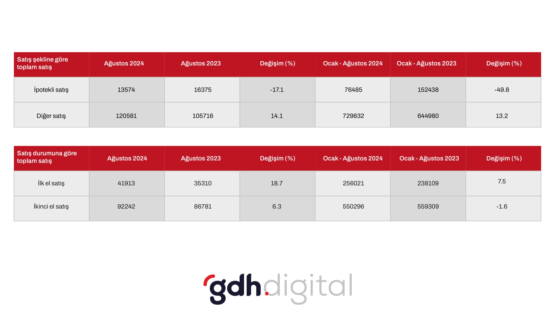Türkiye genelinde ikinci el konut satışları Ağustos ayında bir önceki yılın aynı ayına göre yüzde 6,3 artış göstererek 92 bin 242 oldu. Toplam konut satışları içinde ikinci el konut satışının payı yüzde 68,8 oldu. İkinci el konut satışları Ocak-Ağustos döneminde ise bir önceki yılın aynı dönemine göre yüzde 1,6 azalışla 550 bin 296 olarak gerçekleşti.