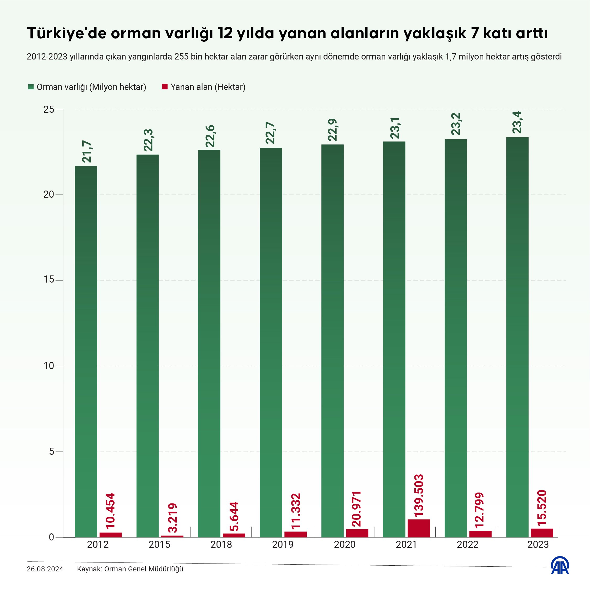 Böylece 2012-2023 döneminde Türkiye'nin orman varlığı yaklaşık 1,7 milyon hektar arttı. Aynı dönemde yaklaşık 255 bin hektarlık alan da orman yangınlarında zarar gördü. Söz konusu dönemde Türkiye'de yanan alanların yaklaşık 7 katı kadar orman varlığı artmış oldu.