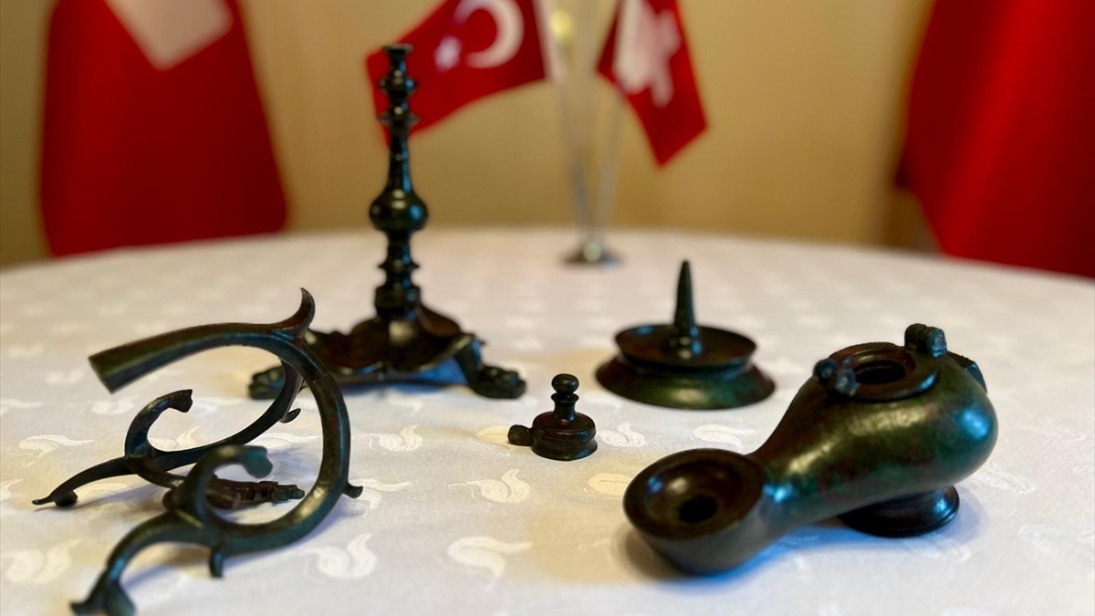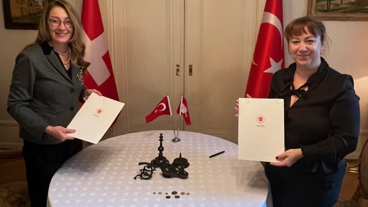 İsviçre'de yürütülen soruşturmalar kapsamında ele geçirilen ve Milattan Sonra (MS) 4-7'nci yüzyıllar arasına tarihlenen kandil, 7 sikke ve 1 altın madalyon Türkiye'ye iade edildi.
