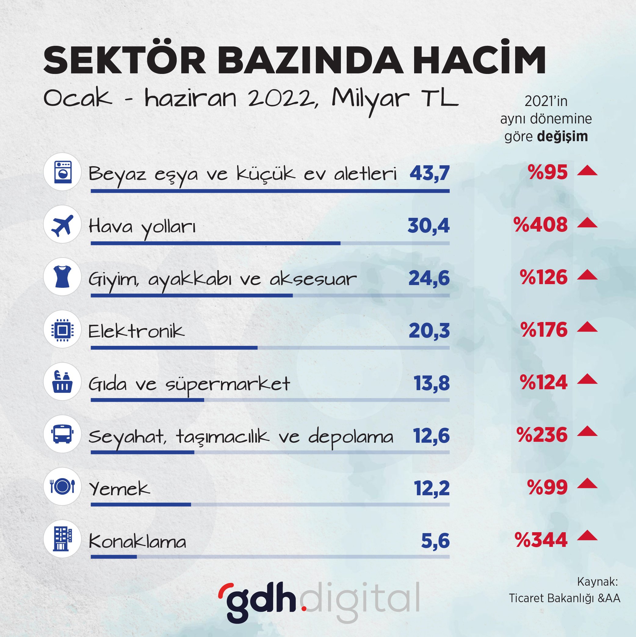 Sektör bazında e-ticaret hacmi değerlendirildiğinde beyaz eşya ve küçük ev aletleri yaklaşık 43,7 milyar lira, hava yolları 30,4 milyar lira, giyim, ayakkabı ve aksesuar 24,6 milyar lira, elektronik sektörü ise 20,3 milyar liralık hacimle öne çıktı. Bu sektörleri gıda ve süpermarket, seyahat taşımacılık ve depolama, yemek ve konaklama sektörleri izledi.