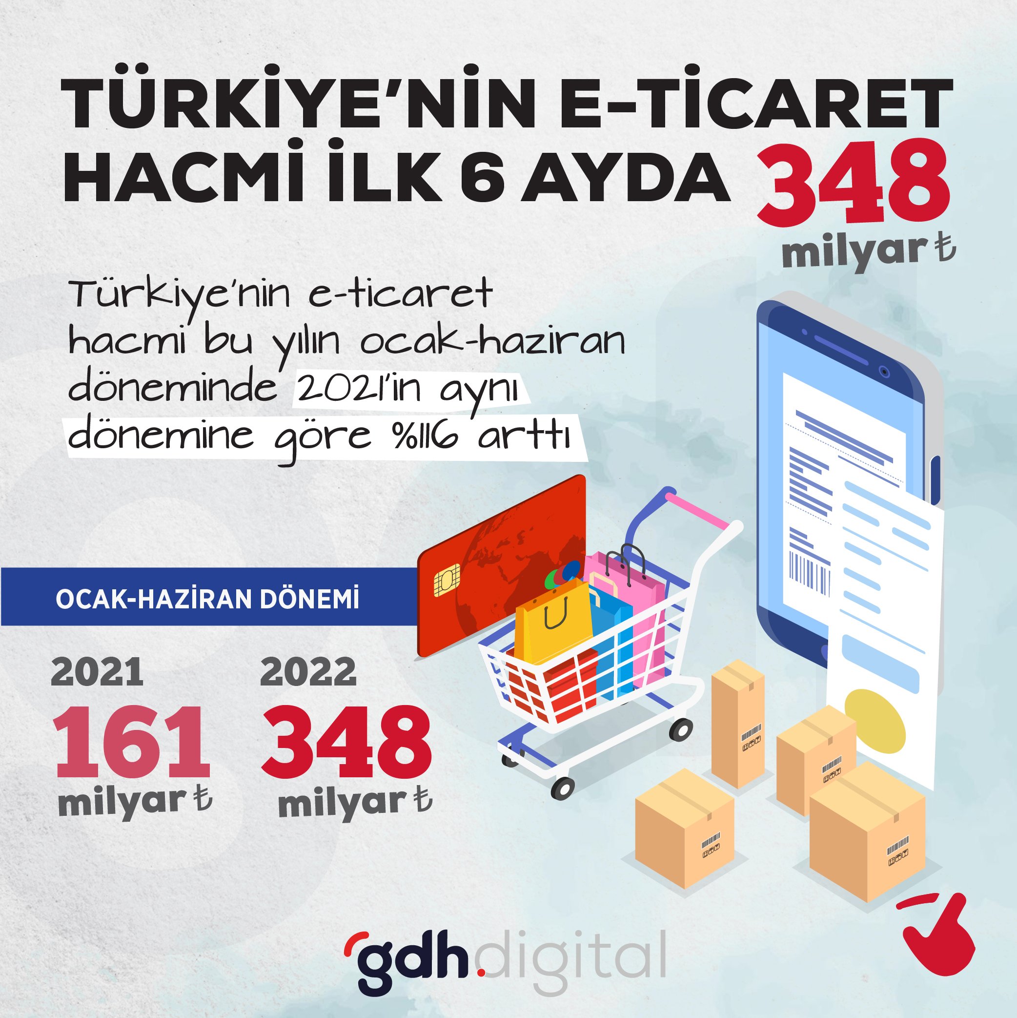 Türkiye'nin e-ticaret hacmi bu yılın ocak-haziran döneminde geçen yılın aynı dönemine göre yüzde 116 artışla 348 milyar liraya ulaştı.