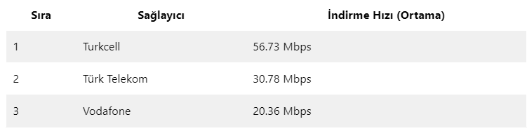 En hızlı mobil internet sağlayıcıları listesinin zirvesinde Turkcell olduğunu görüyoruz. Şirket, ortalama olarak 56.73 Mbps hız sunuyor. İkinci sırada ise 30.78 Mbps ile Türk Telekom, son sırada 20.36 Mbps sunan Vodafone yer aldı.