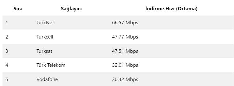 En hızlı sabit interneti sunan sağlayıcı ise ortalama 66.57 Mbps ile TurkNet oldu. Hemen ardından onu 47.77 Mbps ile Turkcell ve 47.51 Mbps ile Turksat takip etti. Akabinde 32.01 Mbps ile Türk Telekom‘u, sonuncu sırada ise 30.42 Mbps ile Vodafone‘u görüyoruz.