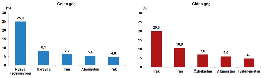 Türkiye'den göç eden yabancı uyruklu nüfus içinde ilk sırayı %20 ile Irak vatandaşları aldı. Irak'ı, %10,6 ile İran, %7 ile Özbekistan, %6 ile Afganistan ve %4,8 ile Türkmenistan vatandaşları takip etti.