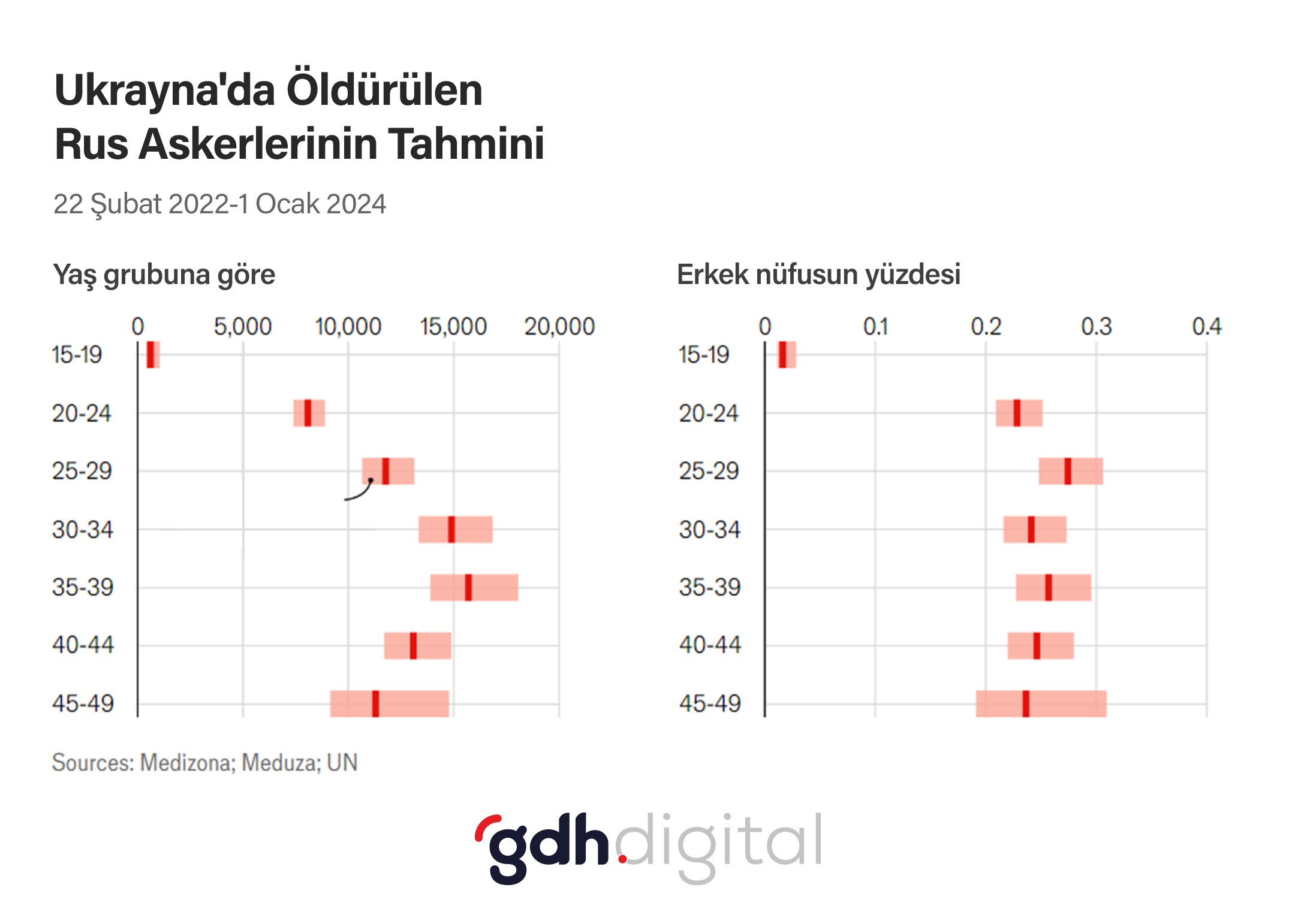 35 ila 39 yaş arasındaki askerler en yüksek ölüm oranına sahip. Ancak erkek nüfusun yüzdesi olarak en yüksek kayıpları 25 ila 29 yaş arasındakiler yaşıyor. Veriler, tam ölçekli savaşın başlangıcından bu yana Ukrayna'da 20 ila 50 yaşları arasındaki tüm Rus erkeklerinin yüzde 1'inden fazlasının öldürülmüş ya da ağır şekilde yaralanmış olabileceğini gösteriyor.
