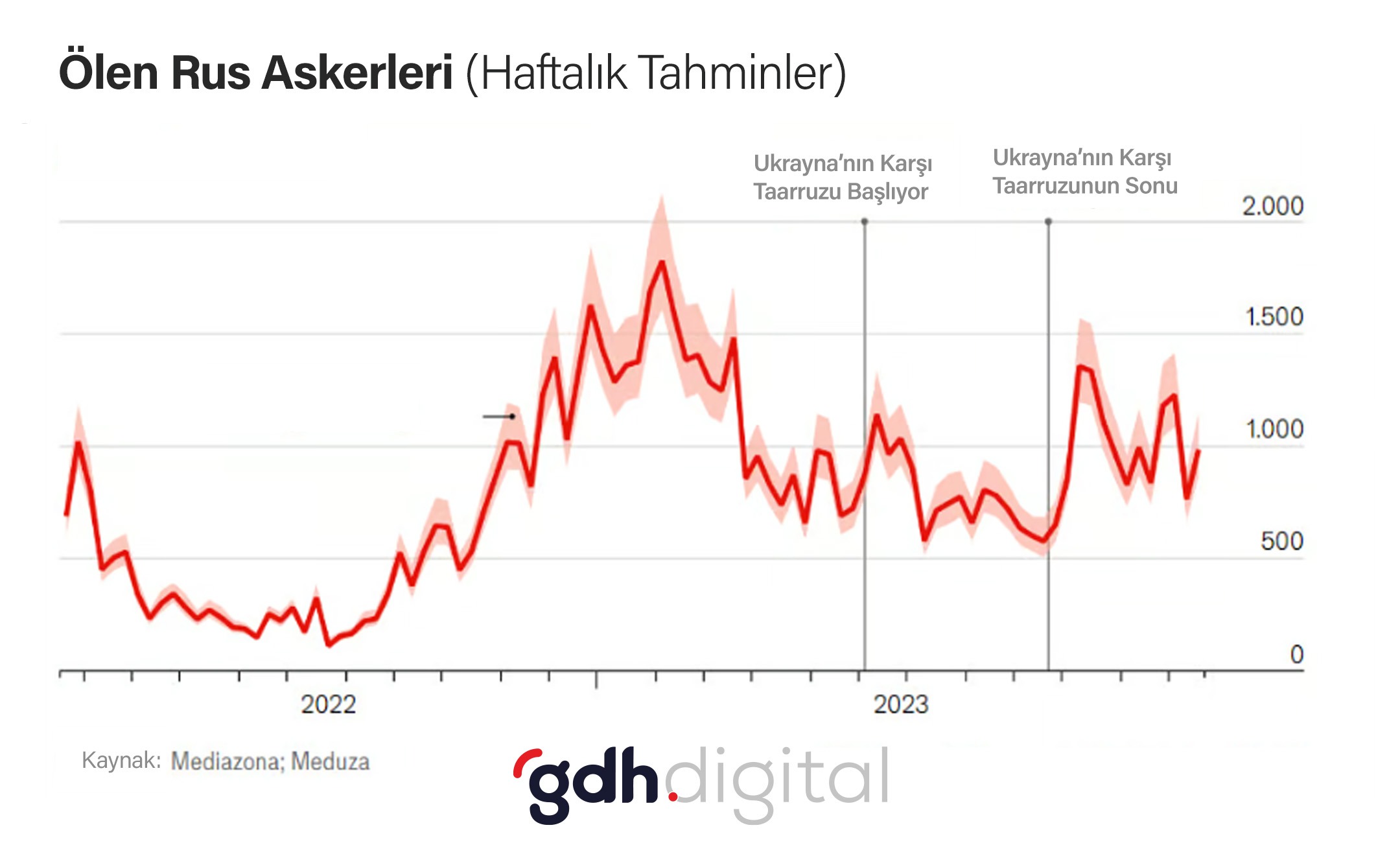 Bu, Ukrayna'nın 2023'teki karşı saldırısının başlangıcı ve doruk noktası sırasında Rusya'nın kayıplarında gözle görülür artışlar olduğunu ve geçen kış Bakhmut savaşı sırasında önemli kayıplar olduğunu gösteriyor. Bu veriler kayıp askerlerin veya çatışmada ağır yaralanan askerlerin sayısını içermiyor.