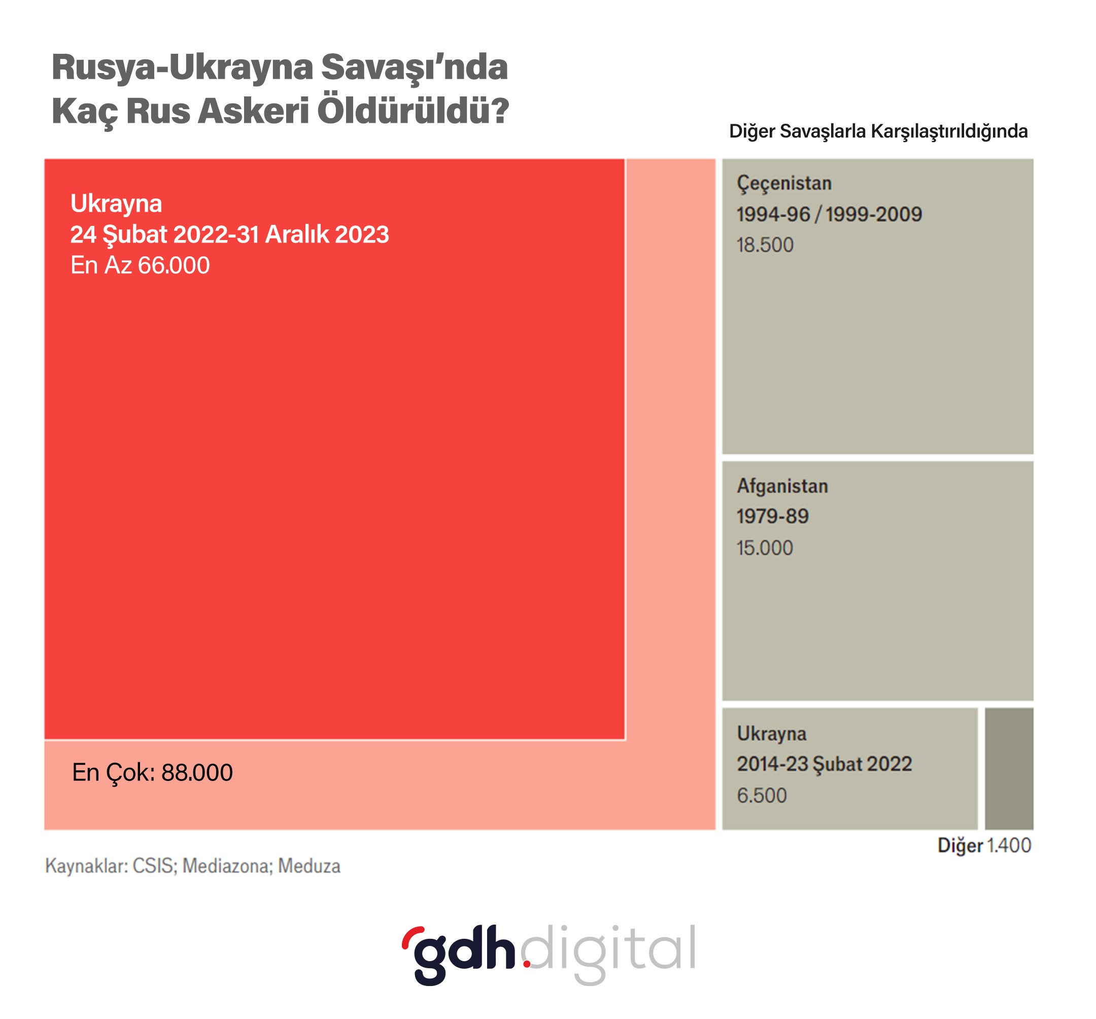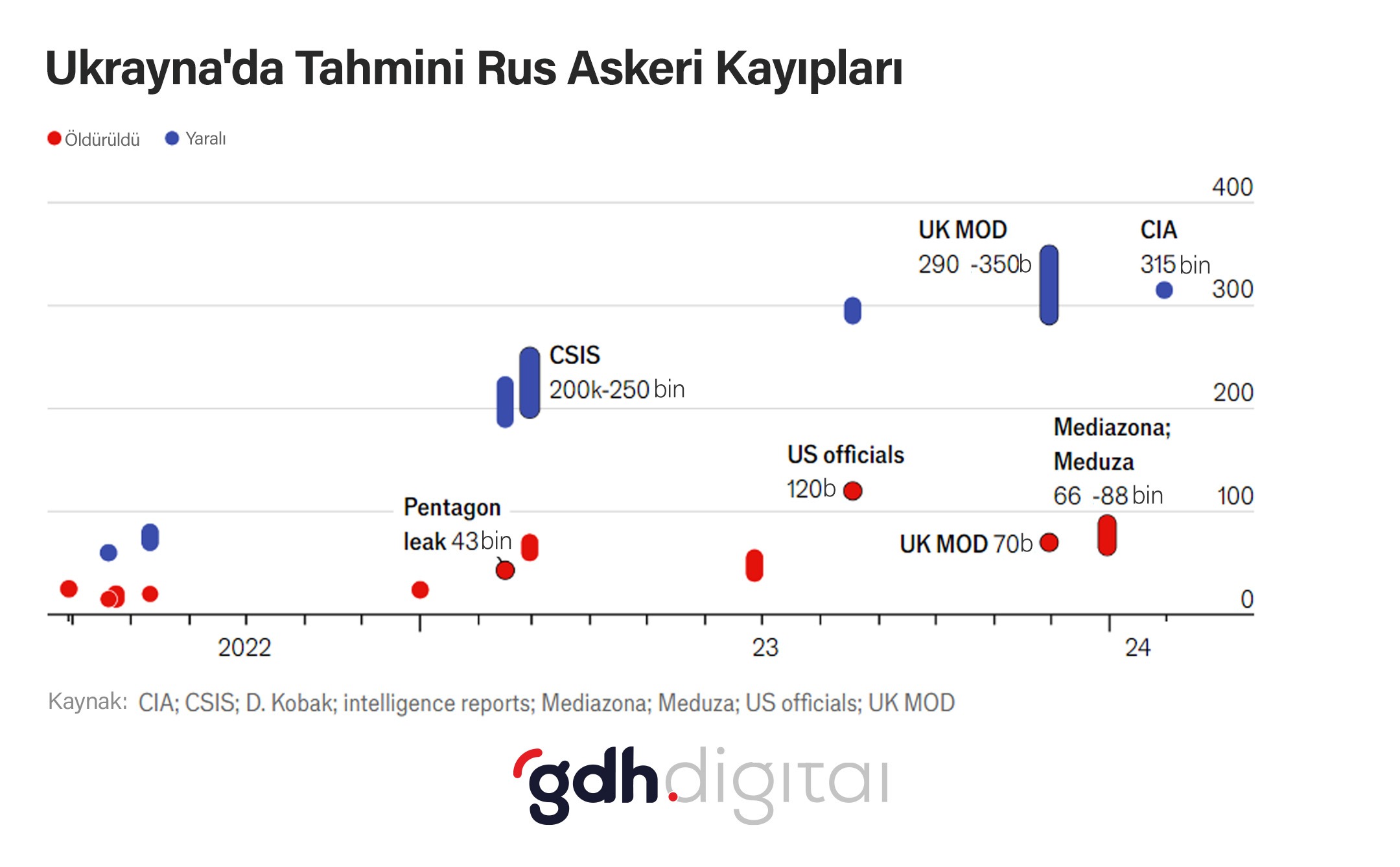 ABD Savunma Bakanlığı'nın verilerine göre, 2023 sonu itibarıyla 290 bin ila 460 bin arasında Rus askeri öldü ya da görev yapamayacak şekilde yaralandı. Bu, Rusya'nın savaşın başındaki toplam asker sayısına denk geliyor.