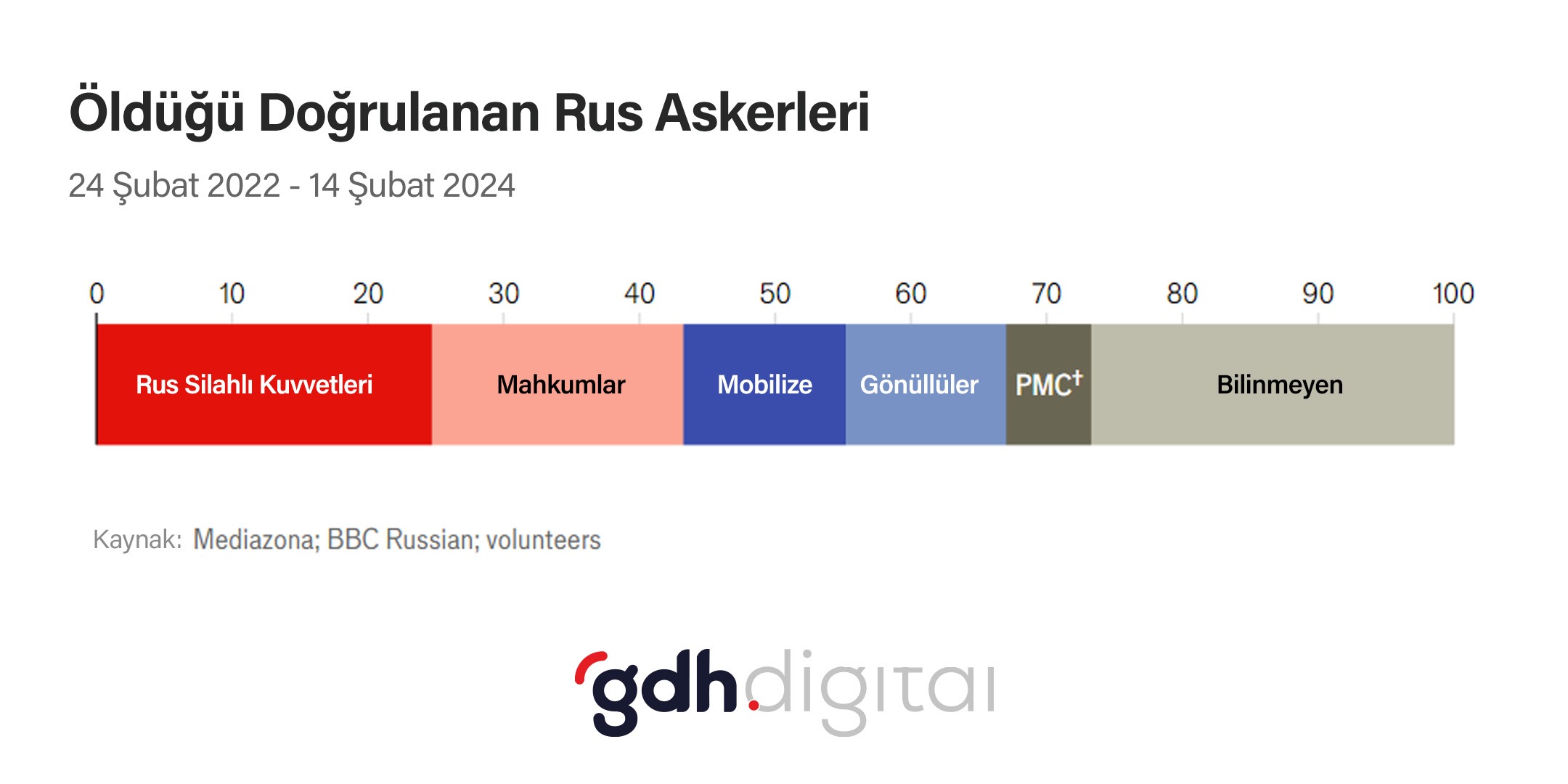 Bu tablo, Ukrayna'da ölen Rus askerlerinin dökümünü veriyor. Rusya'nın mahkumları ve özel askeri şirketleri (PMC'ler) kullanması konusunda çok şey yapılmış olmasına rağmen bu askerler nüfusun azınlığını oluşturuyor gibi görünüyor. Belirlenen askerlerin yüzde 19'undan azı hükümlüydü ve yaklaşık %25'i düzenli askeri birliklerdeydi.