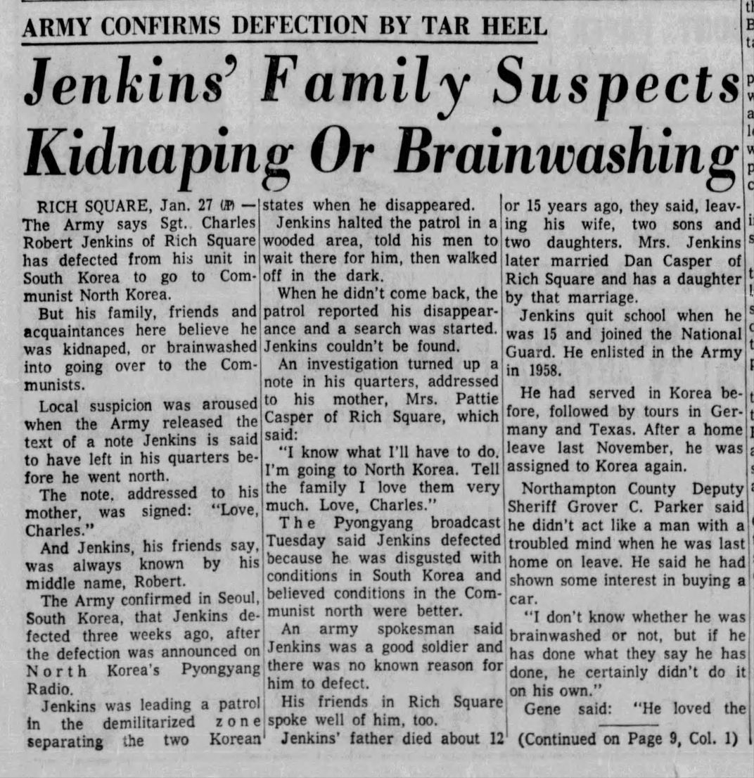 Aileden bazıları Jenkins'in Kuzey Kore'ye gitmeye zorlandığını ya da en azından yanıltıldığını düşünüyordu. Jenkins'in kaçmadan önce kışlasında bıraktığı iddia edilen bir mektubun raporları da belirsizliği artırıyordu .