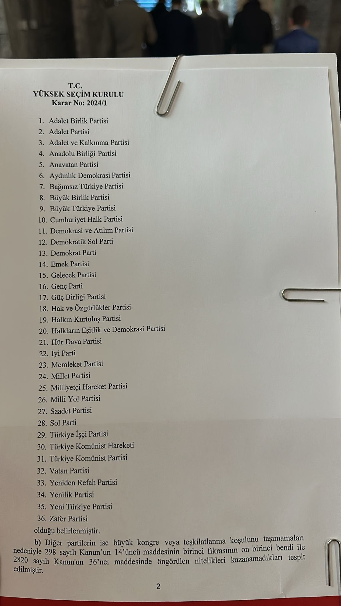 Yüksek Seçim Kurulu (YSK) Başkanı Ahmet Yener, 31 Mart 2024 yerel seçimlerine katılabilecek siyasi partileri açıkladı.