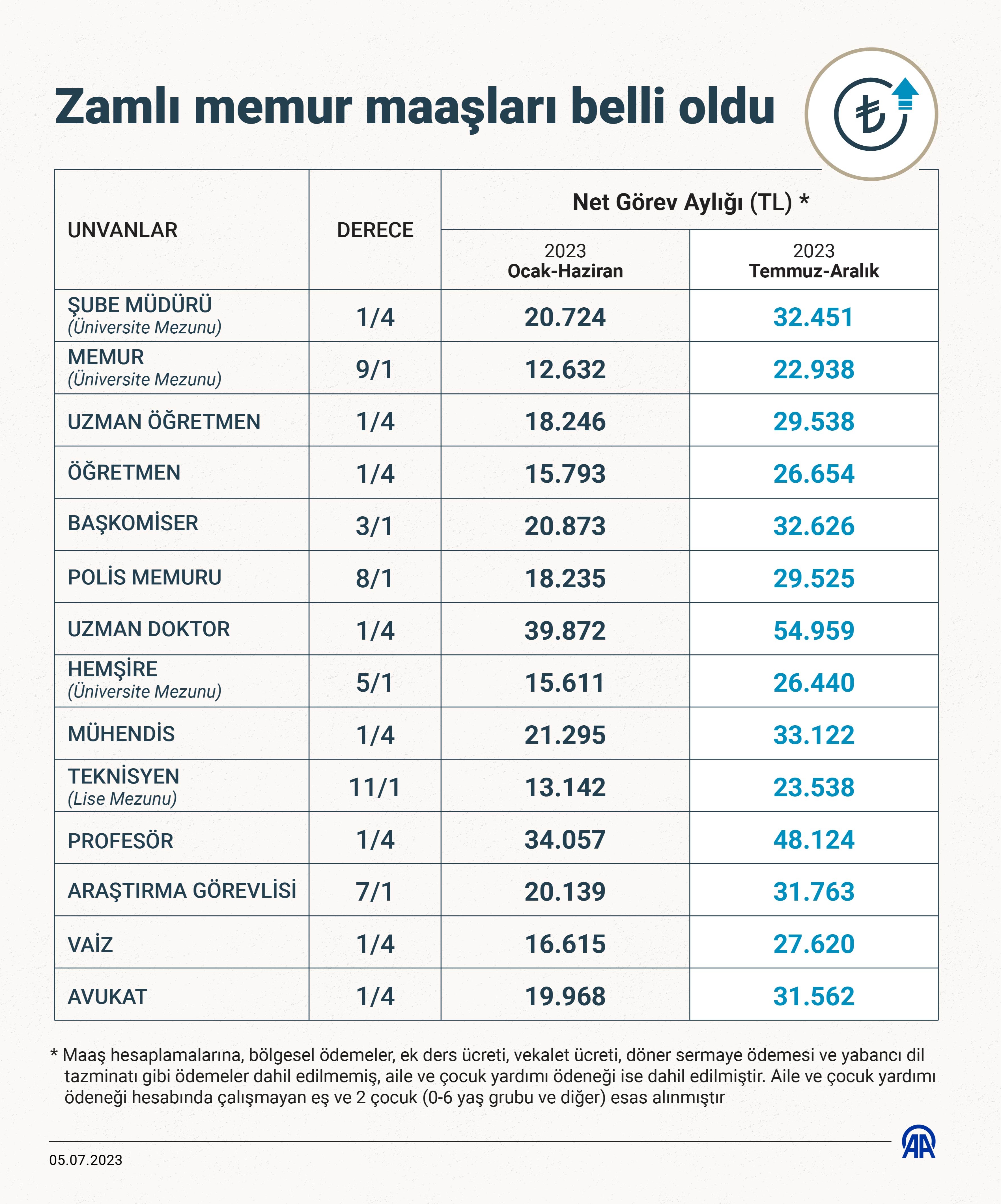 Söz konusu artışlar neticesinde, 2023 Temmuz dönemi itibarıyla kamu görevlilerinin aile yardımı dahil net maaşları (TL) şöyle: